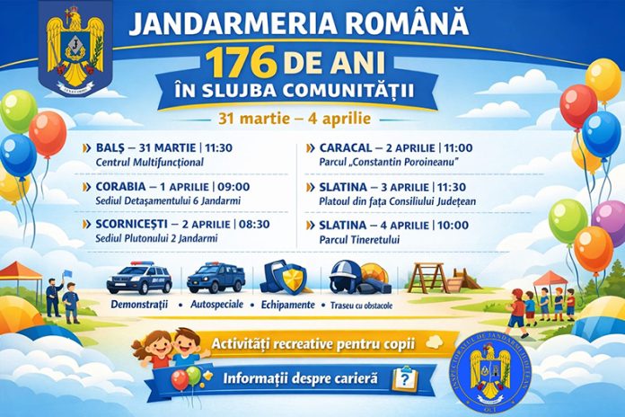 Cu prilejul aniversării a 176 de ani de la înființarea Jandarmeriei Române, Inspectoratul de Jandarmi Județean Olt organizează, pe parcursul unei săptămâni, o serie de activități dedicate Zilei Armei. Evenimentele se vor desfășura atât în municipiul Slatina, cât și în localitățile unde unitatea are subunități operative – municipiul Caracal și orașele Corabia și Balș – fiind menite să marcheze simbolic rolul și importanța Jandarmeriei în slujba comunității.
