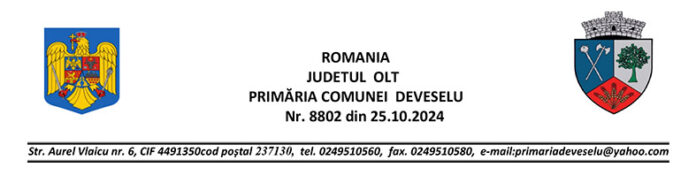 Dosarele se depun pana in data de 07.11.2024 orele 15.00 la sediul Primariei comunei Deveselu iar rezultatele selectării dosarelor se afișează în data de: 11.11.2024. Depunere contestatii 11.11.2024 – 12.11.2024 ora 10.00 si solutionare contestatii data 12.11.2024 orele 15.00.