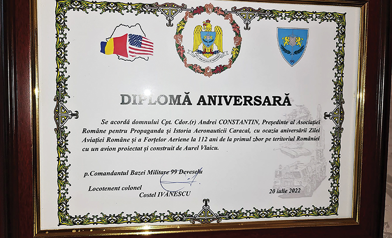 Momentul festiv a fost încununat, de asemenea, cu acordarea unor diplome aniversare și plachete d-lui Andrei Constantin, reprezentant ARPIA Caracal, de către Lt. Col. Costel Ivănescu, comandatul bazei Militare 99 Deveselu.