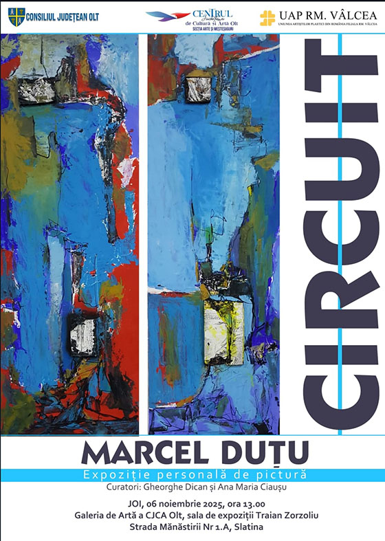 Secția Arte și Meșteșuguri a Centrului Județean de Cultură și Artă Olt, în parteneriat cu Uniunea Artiștilor Plastici din România, Filiala Râmnicu Vâlcea, organizează vernisajul expoziției personale de pictură „CIRCUIT”, semnată de artistul Marcel Duțu, expert al Clasei de Pictură din Drăgănești-Olt. Evenimentul va avea loc joi, 6 noiembrie 2025, la ora 13:00, în Sala de expoziții „Traian Zorzoliu” a Galeriei de Artă a CJCA Olt, pe Str. Mănăstirii nr. 1A, în Municipiul Slatina.
