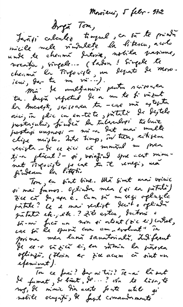 Dragă Tom, rupe, acum, te rog bucățica de hârtie ce urmează și care conține adresa mea de la munte pe perioada 1 febr[uarie] ~ …(?): camera 302, secția a III-a, Sanatoriul Moroieni, jud[ețul] Dâmbovița.