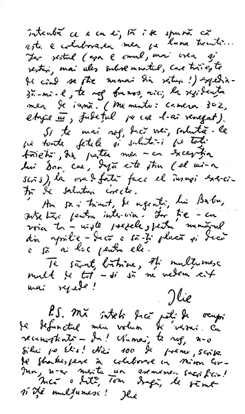 Mă întrebi dacă poți să te ocupi de defunctul meu volum de versuri. Cu recunoștință, da! Numai, te rog, n-o silui pe Elis5! Nici 100 de poeme, scrise de Shakespeare în colaborare cu Miron Cordun6, n-ar merita un asemenea sacrificiu!