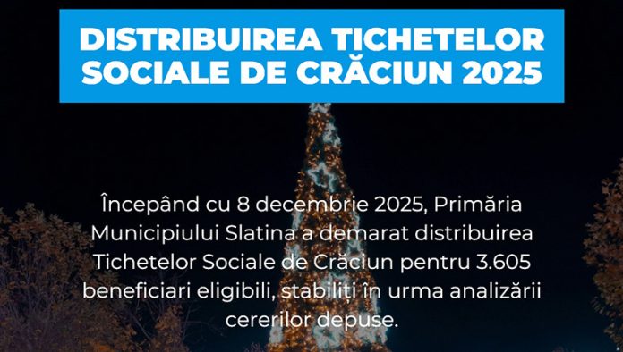 Primăria Municipiului Slatina informează că, începând cu 8 decembrie 2025, a demarat acțiunea de distribuire a Tichetelor Sociale de Crăciun, în valoare de 150 lei/beneficiar, prin intermediul Companiei Naționale Poșta Română.