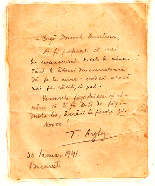 Dacă revista Memoria Oltului și Romanaților ne arată cu generozitate, în mai multe apariții, epistolele trimise de autor marilor critici literari Perpessicius și Cioculescu, iată că Linia Întâi vine astăzi cu documente inedite, de patrimoniu național, și anume cu scrisorile semnate de Perpessicius, de fiul acestuia, D.D. Panaitescu, și chiar de către marele poet Tudor Arghezi, adresate scriitorului nostru slătinean.