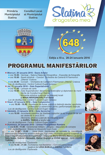 Începând de ieri, 20 ianuarie 2016, și până duminică, 24 ianuarie a.c., inclusiv, Slatina se îmbracă în straie de sărbătoare, pentru a celebra împlinirea a 648 de ani de la prima atestare documentară a municipiului Slatina. Pe parcursul a cinci zile, se va desfășura ediția a XI-a a Festivalului „Slatina, dragostea mea”. Festivalul este organizat de Primăria Municipiului Slatina și se va desfășura pe Esplanadă și la Centrul Cultural „Eugen Ionescu”.