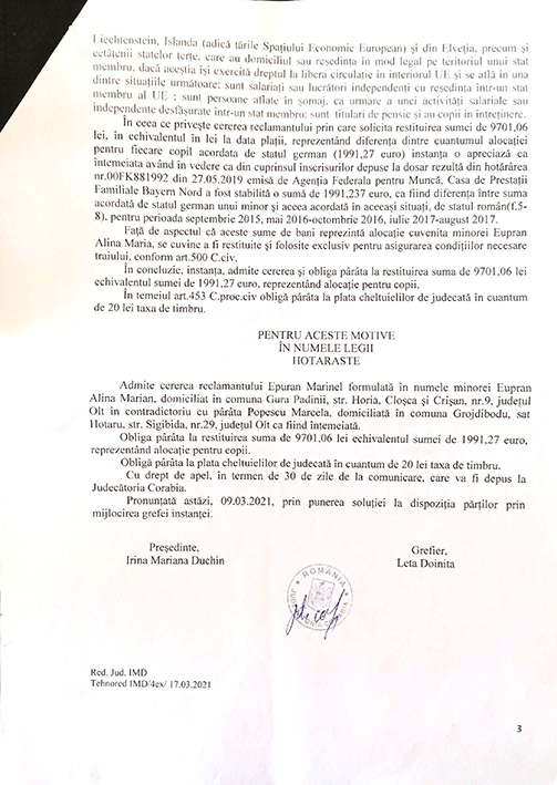 În continuare, reclamantul a învederat faptul că, în anul 2019, dat fiind că atât acesta, cât și pârâta lucrau în Germania, au solicitat statului alocație pentru minora Epuran Alina Maria, fiind depuse, în acest sens, actele necesare, iar prin hotărârea nr. 00FK881992 din 27.05.2019 emisă de Agenția Federală pentru Muncă, Casa de Prestații Familiale Bayern Nord a fost stabilită suma de 1991,237 euro, fiind diferența între suma acordată de statul german unui minor și aceea acordată în aceeași situație, de statul român.